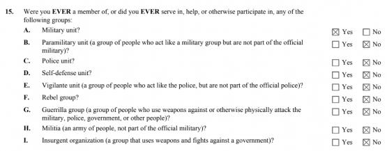 "Have you EVER served in, been a member of, assisted, or participated in any military unit, paramilitary unit, police unit, self-defense unit, vigilante unit, rebel group, guerrilla group, militia,